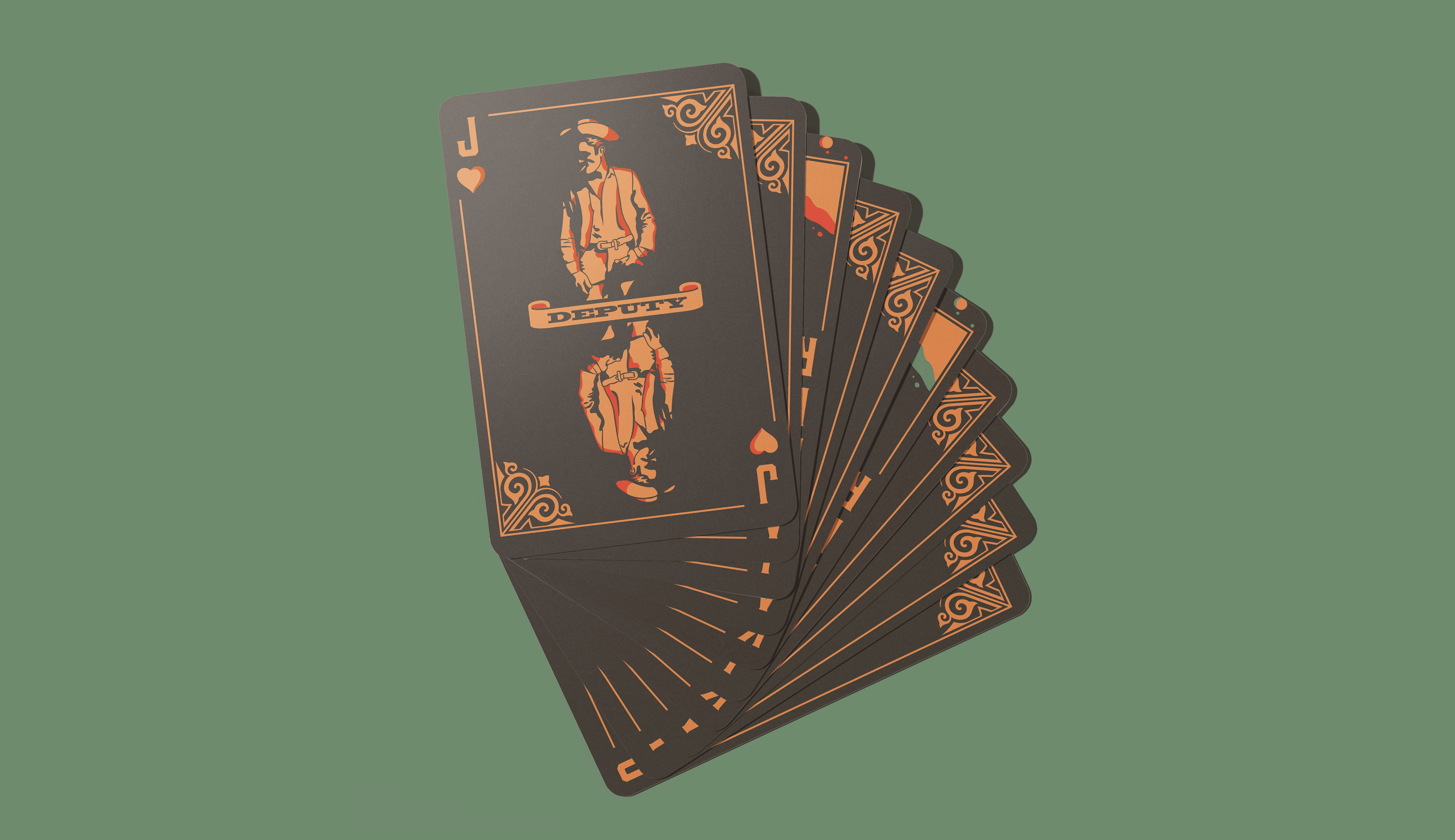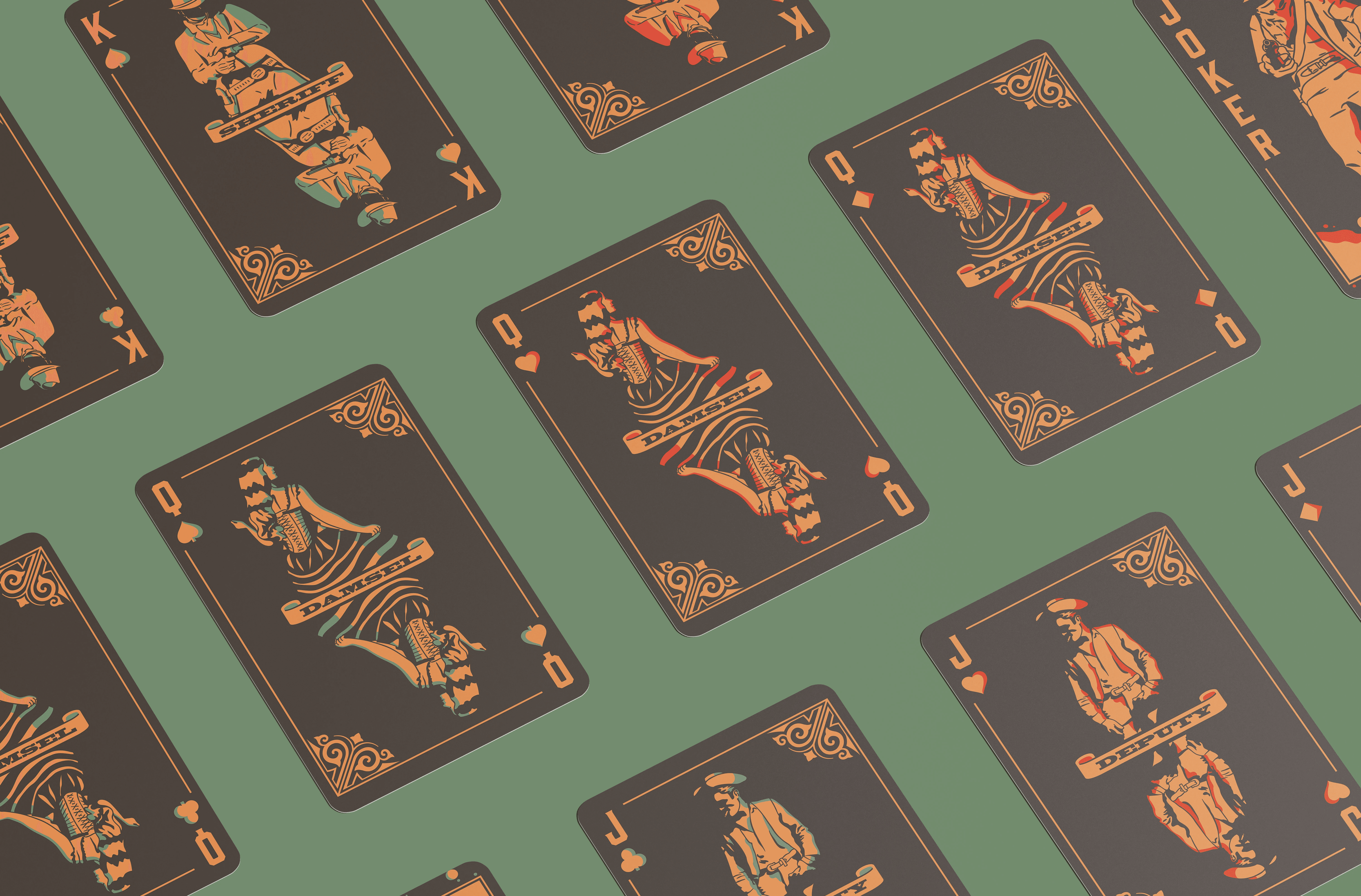 I created a fully illustrated deck of cards, each piece designed to feel aged and authentic, using classic Western imagery: cowboys, outlaws, and frontier women to evoke the rugged, dramatic energy of the era.
